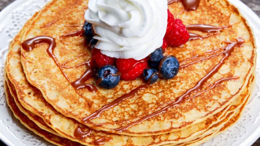 Die Eier mit dem Zucker cremig aufschlagen, dann mit der Milch verrühren. Nun Salz, Mehl und Backpulver dazugeben und alles zu einem glatten Teig rühren. Danach den Teig für ca. 15 Minuten ruhen lassen, da das Mehl noch ausquillt. Dann 1-2 große Schöpfkellen Teig in eine auf mittlere Hitze erhitzte, beschichtete Pfanne geben. Nach ca. 2 Minuten bilden sich kleine Bläschen, dann den Pfannkuchen einmal wenden und von der anderen Seite schön goldbraun ausbacken.