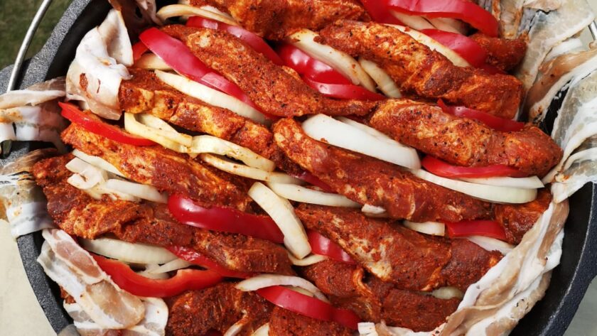 Den Boden sowie den Rand des Dutchoven mit Bacon auslegen. Dann den Dutchoven schräg stellen und das Fleisch, sowie die Zwiebeln und Paprika abwechselnd hochkant stehend in den Dutchoven schichten. Nachdem alles geschichtet wurde, eine ganze Packung BBQ-Sauce darüber verteilen. Jetzt zum Schutz noch auf die geschichteten Zutaten eine Schicht Bacon legen.