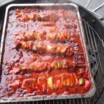 - Jetzt kommt die Mob-Phase. Dazu kommen die Ribs aus der Auflaufform bei 120°C wieder direkt auf den Smoker. Dort werden sie jetzt 2-3 Mal mit einer leckeren BBQ-Sauce bepinselt. Insgesamt sollte die Mop-Phase dann ca. 45 Minuten andauern.