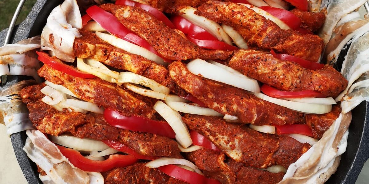 Den Boden sowie den Rand des Dutchoven mit Bacon auslegen. Dann den Dutchoven schräg stellen und das Fleisch, sowie die Zwiebeln und Paprika abwechselnd hochkant stehend in den Dutchoven schichten. Nachdem alles geschichtet wurde, eine ganze Packung BBQ-Sauce darüber verteilen. Jetzt zum Schutz noch auf die geschichteten Zutaten eine Schicht Bacon legen.
