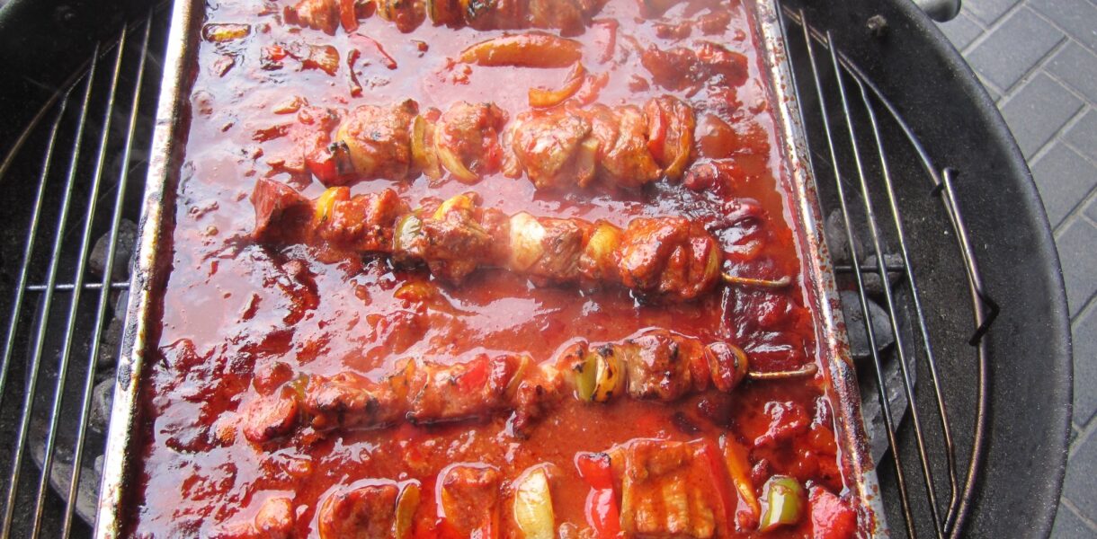 Jetzt die Soße in der Koncis-Auflaufform (Ikea) ansetzen. Wenn die Soße nach allen Zutaten dann schön köchelt noch einmal umrühren und dann die fertigen Spieße einlegen, so dass diese möglichst gut mit Soße bedeckt sind. Das Ganze dann noch gut eine Stunde schmurgeln lassen und der Gaumensex ist perfekt.