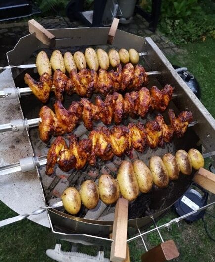 Erst die Spieße schwach direkt und gleichzeitig stark indirekt angrillen. Die fertigen Spieße in eine Schale und Alufolie drüber.